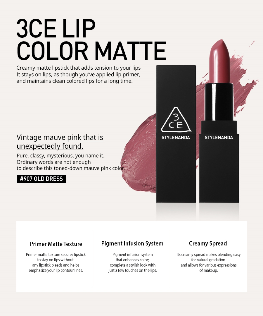 Son thỏi lì 3CE Lip Color Matte - #907 (Old Dress - Hồng Đất) (New)